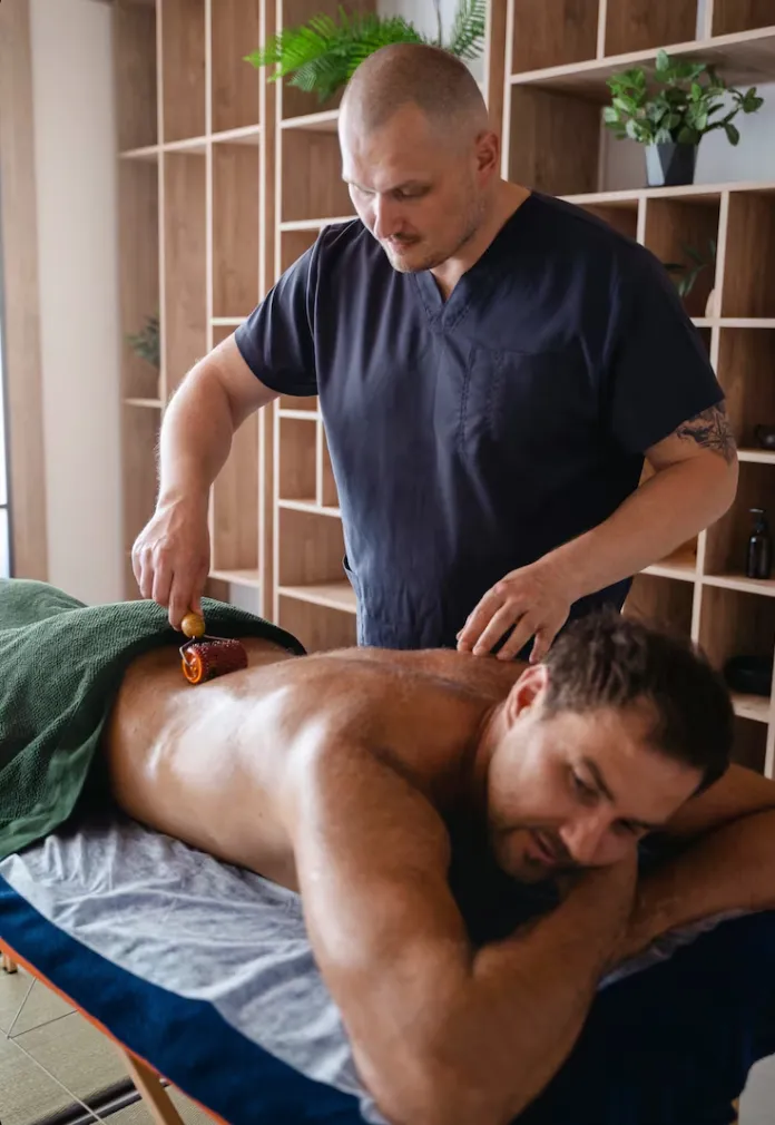 Skoncentrowana praca na powięziach i punktach spustowych. Uwalnia od przewlekłego napięcia w plecach, barkach i odcinku lędźwiowym.